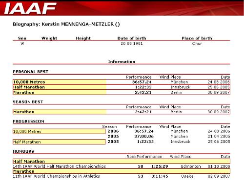 Die oben als persönliche Bestzeit aufgeführte 10.000 Meter Zeit von 36:57,24 aus München vom 24.8.2007 ist ebenfalls erfunden, die Rennen haben nicht stattgefunden. Das gab die Liechtensteinerin selbst mittlerweile zu. Damit erübrigen sich natürlich auch meine oben gemachten Hochrechnungen auf potentielle Bestzeiten über Marathon. Ihre wohl tatsächliche 21,1 km Zeit von 1:25:29, erzielt bei den Halbmarathon Weltmeisterschaften in Edmonton, läßt eine Zeit über Marathon von knapp über 3:00 Stunden zu. In den Bestenlisten des Liechtensteinischen Verbandes, die übrigens bis heute noch nicht korrigiert sind (Zugang am 15.12.2007